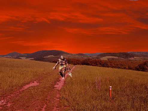 Keď sa zdalo že okolo niet ani živej duše, povyliezali z úkrytu, pobrali nástroje a vydali sa na cestu hlbšie do džungle Tribeč. Síce to bolo veľmi nebezpečné, rozhodli sa ísť po jedinej vydupanej cestičke, lebo sami na voľnej nohe v lese by dlho neprežili, buď by sa stratili, alebo by ich ulovil nejaký Krajanský Uga Uga (Po Krajansky Uga Uga znamená Prieskumník [viz. Rozdelenie Krajanov]). Cesta bola bahnistá a po celý čas sa im zdalo, akoby ich niekto sledoval. Asi po 3 hodinách cestovania však započuli divný zvuk šuchotu papradí. Niečo ich na 100% sledovalo, bolo počuť jeho dych. Vedci sa obzerali, a ich veliteľ Ruddkon si pripravil úspávaciu pištoľ. Jeden z vedcov to zazrel. Iba na moment videl v hustých kríkoch tie krvavé oči, a silnú obočnú kosť. V momente ako si to uvedomilo že už to nie je nevidené, dalo sa to na útek. Vedci sa za tým rozbehli, nehladiac na risk stratenia sa v lese. Mohlo to priniesť veľké zisky a poznanie. Viedlo ich to cez najväčšie tŕnie a najužšie priestory aké mohli byť, napríklad rozdvojené stromy či úzke priechody medzi skalami. Vedci sa teda rozhodli rozdeliť. Ruddkon sa pripojil k hlavnej skupine, ktorá to mala následovať strmhlav cez každú zábranu. Druhá skupina velená doktorom Tumorom to mala za úlohu pomaly ale bezpečne vystopovať, pre prípad že by sa niečo stalo druhej skupine. My sa teda zameráme hlavne na zápisky druhej skupiny, lebo od nich máme najviac materiálu.